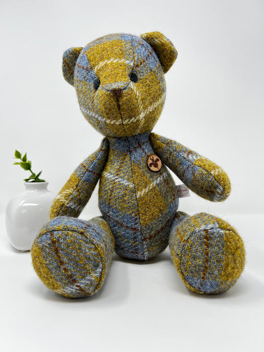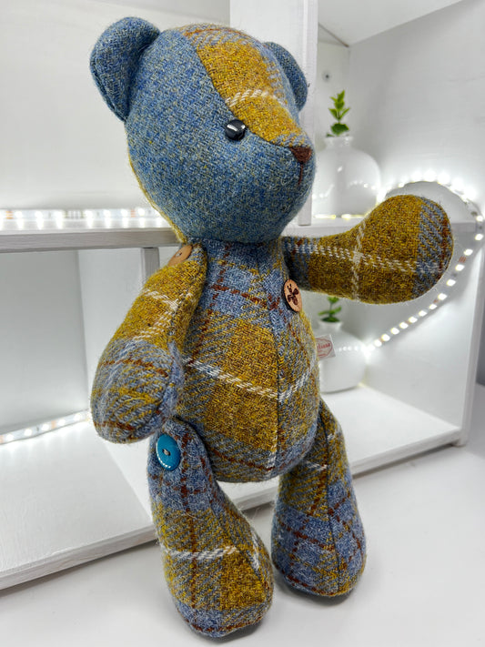 Adorable Handmade Teddy Bear in Blue Mustard Harris Tweed fabric - Full Blue Mustard