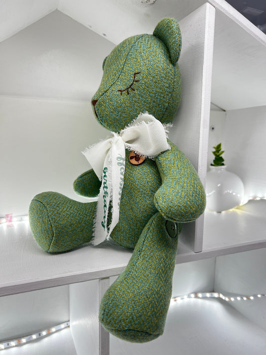 Adorable Handmade Teddy Bear in Green Harris Tweed fabric - cuddly with closed eyes.