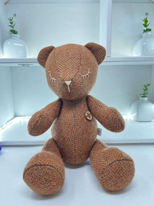 Adorable Handmade Teddy Bear in Camel Harris Tweed fabric - cuddly with closed eyes.