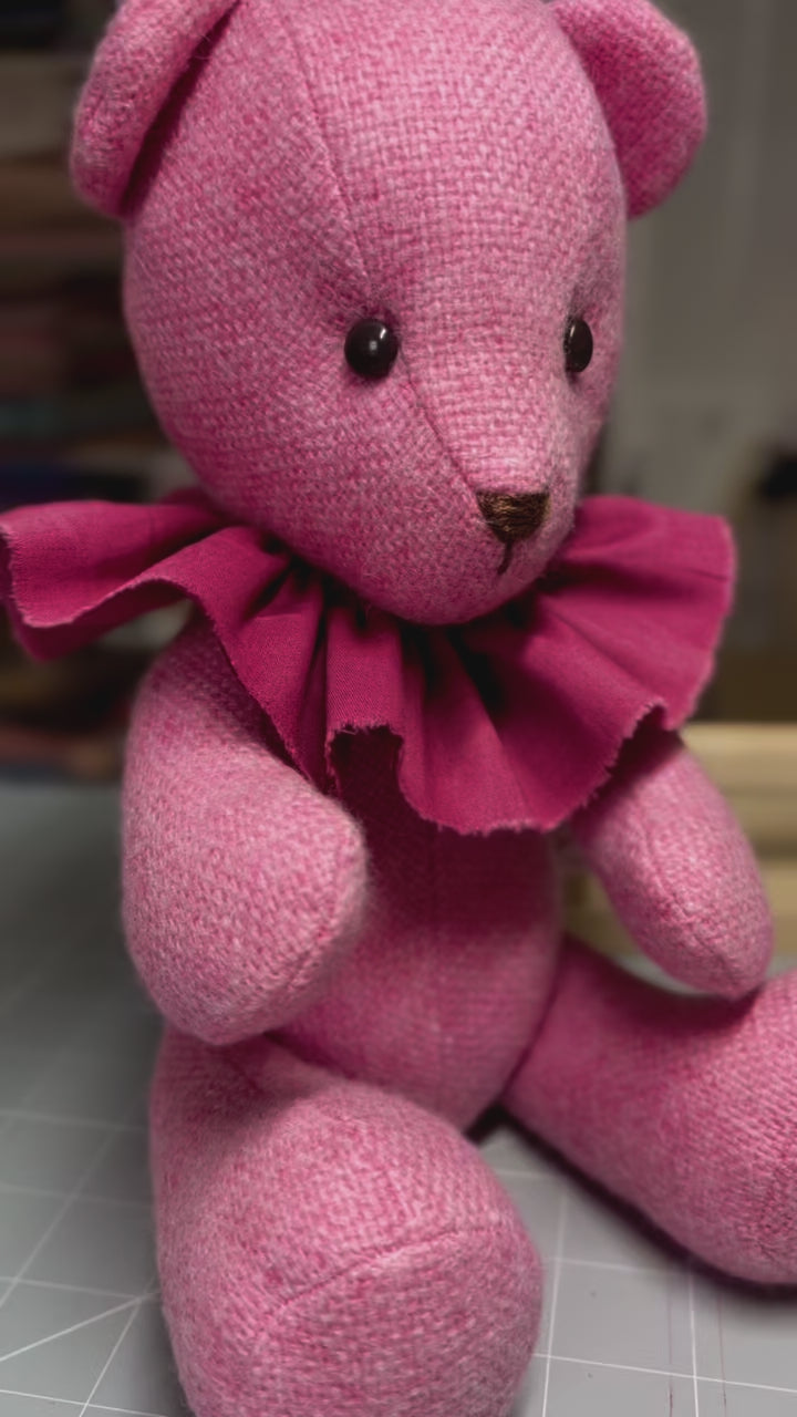 Adorable Handmade Teddy Bear in Pink Manx Tweed fabric - cuddly with closed eyes.