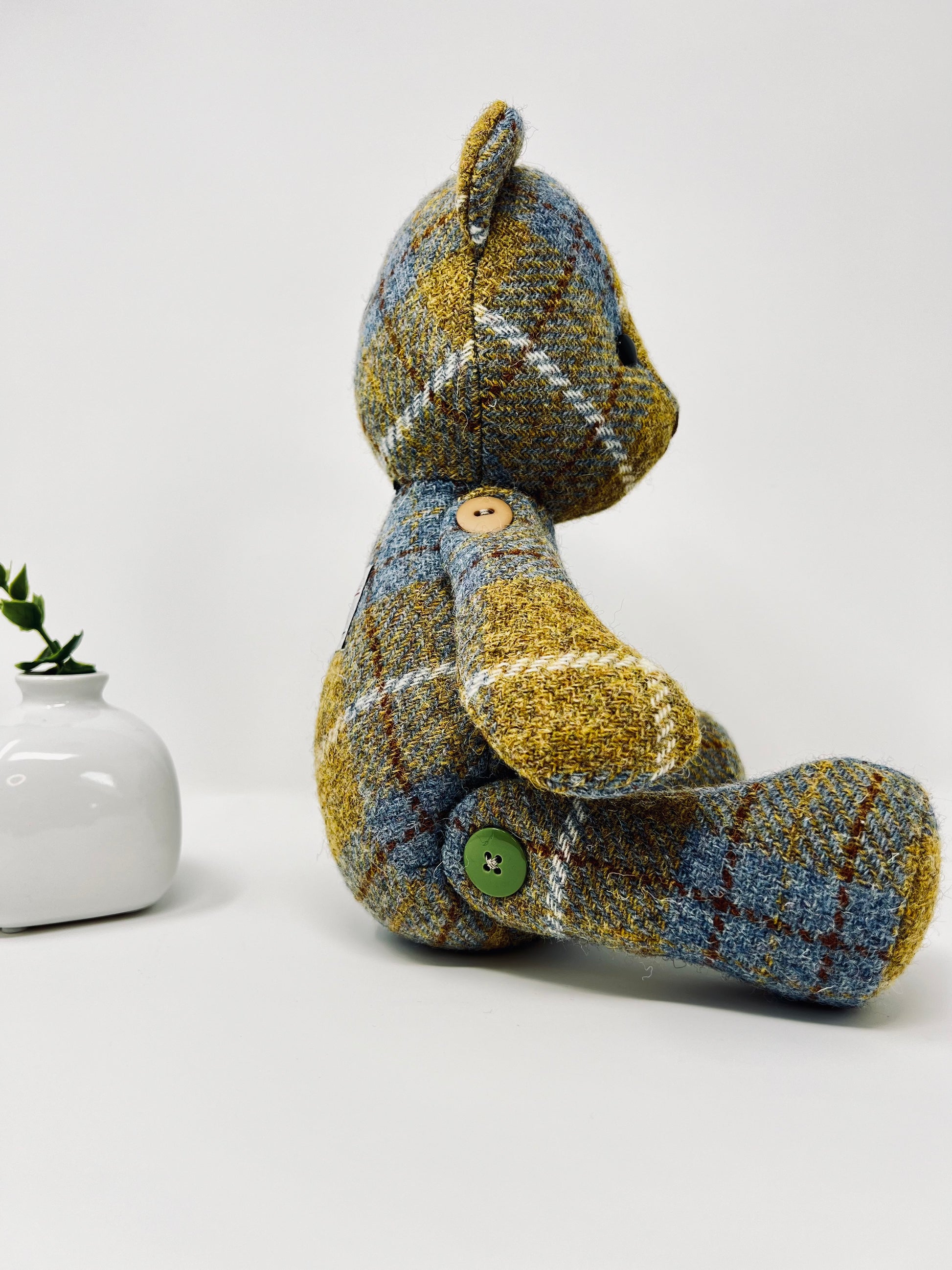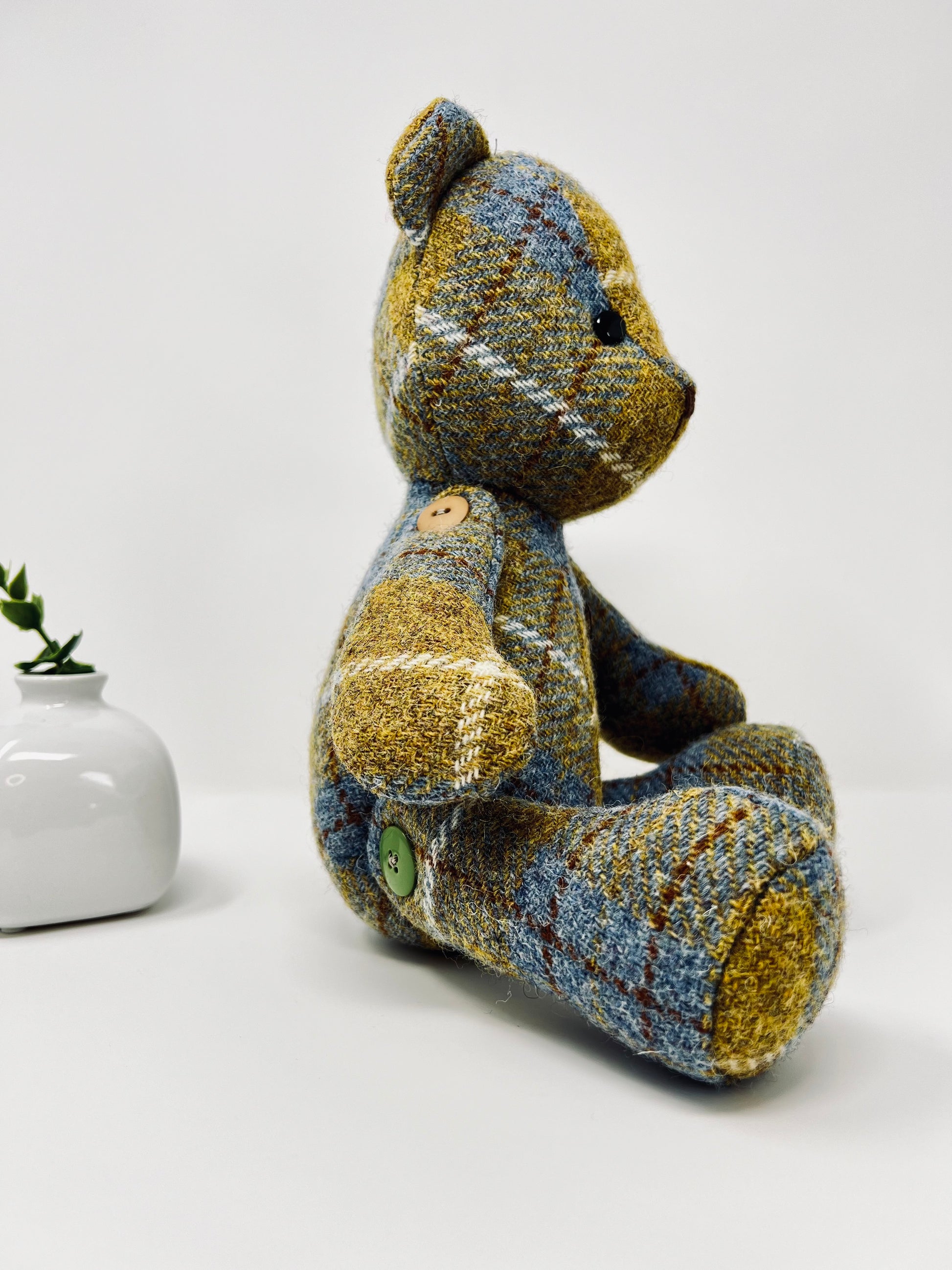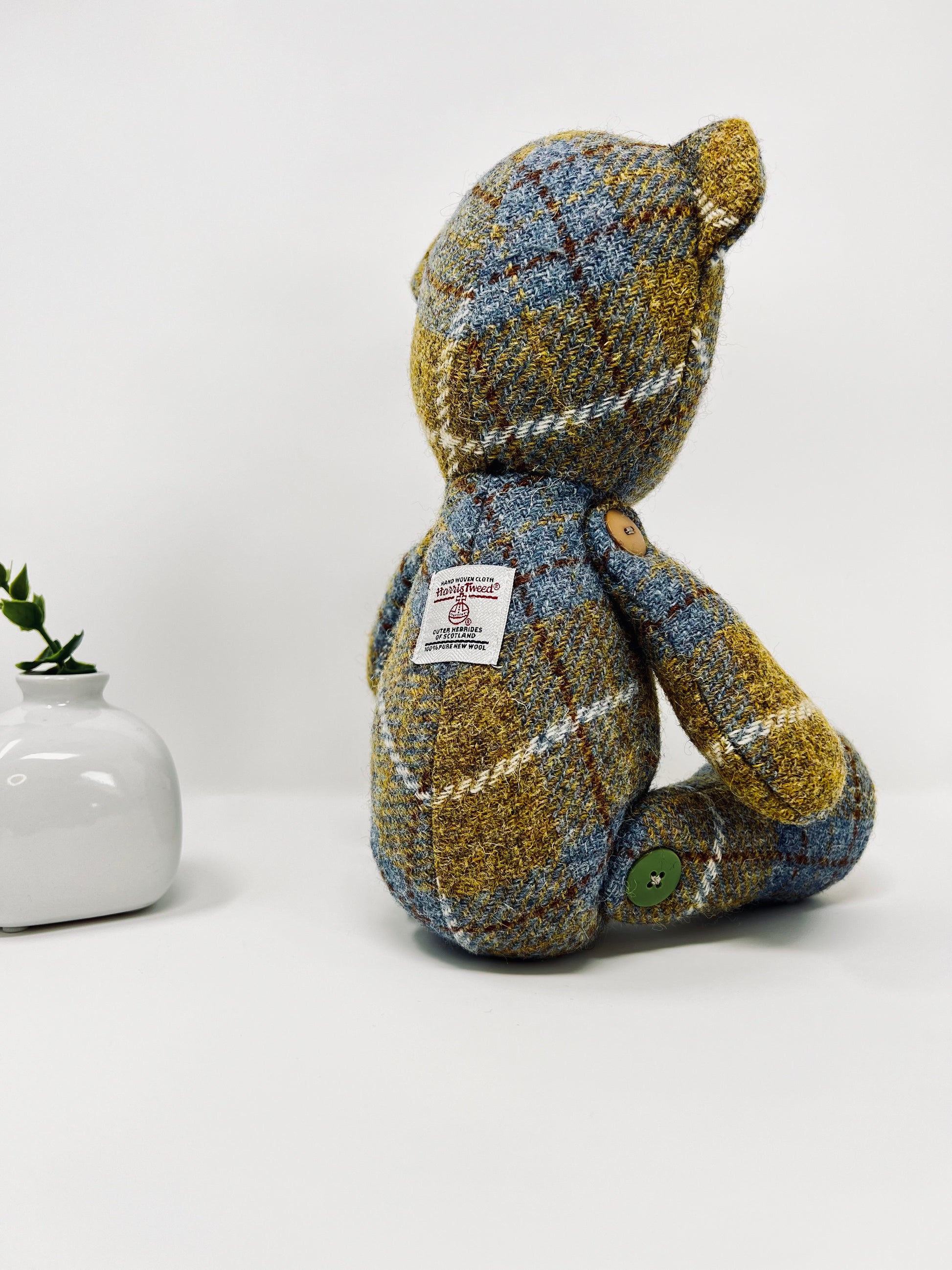 Adorable Handmade Teddy Bear in Blue Mustard Harris Tweed fabric - Full Blue Mustard